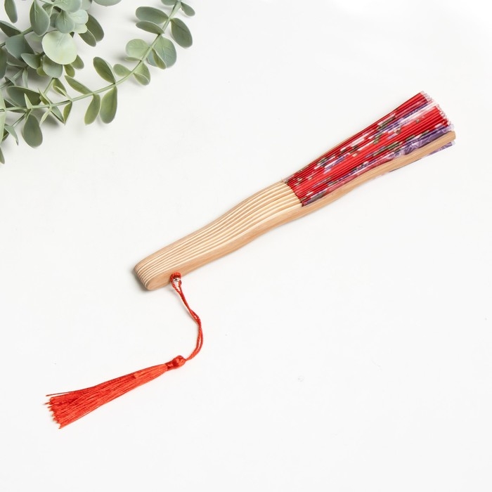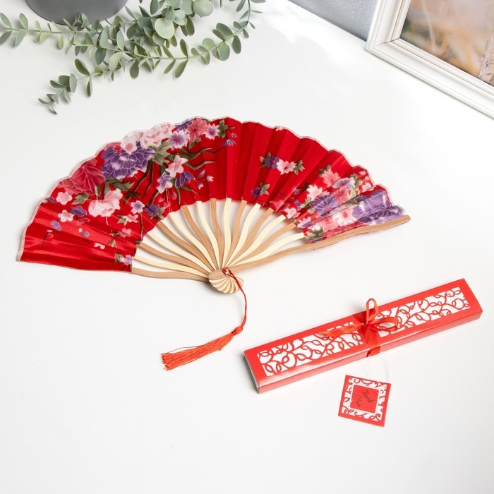 Веер бамбук, текстиль h=21 см изгиб, с кистью "Цветы" в коробке, красный