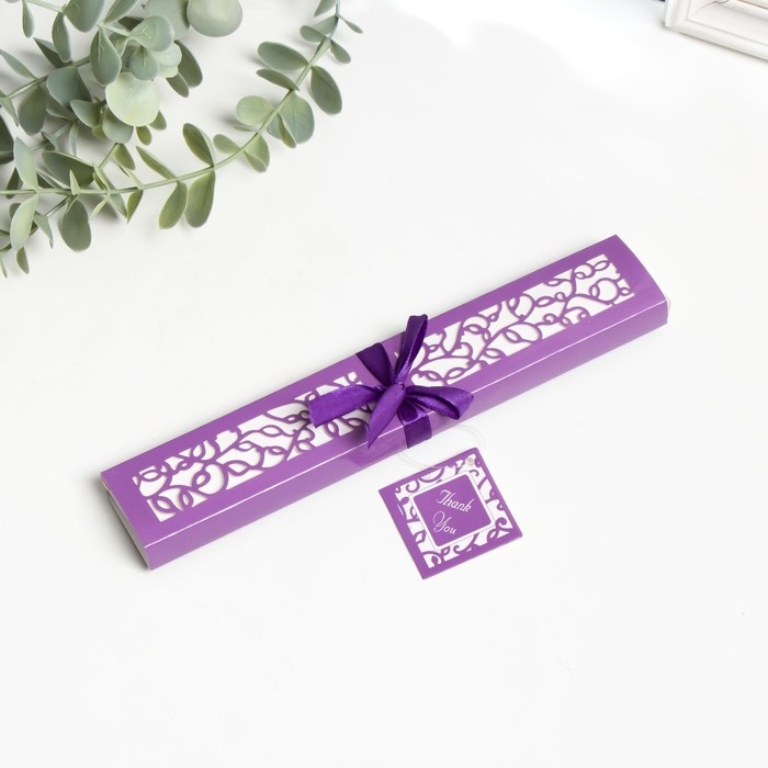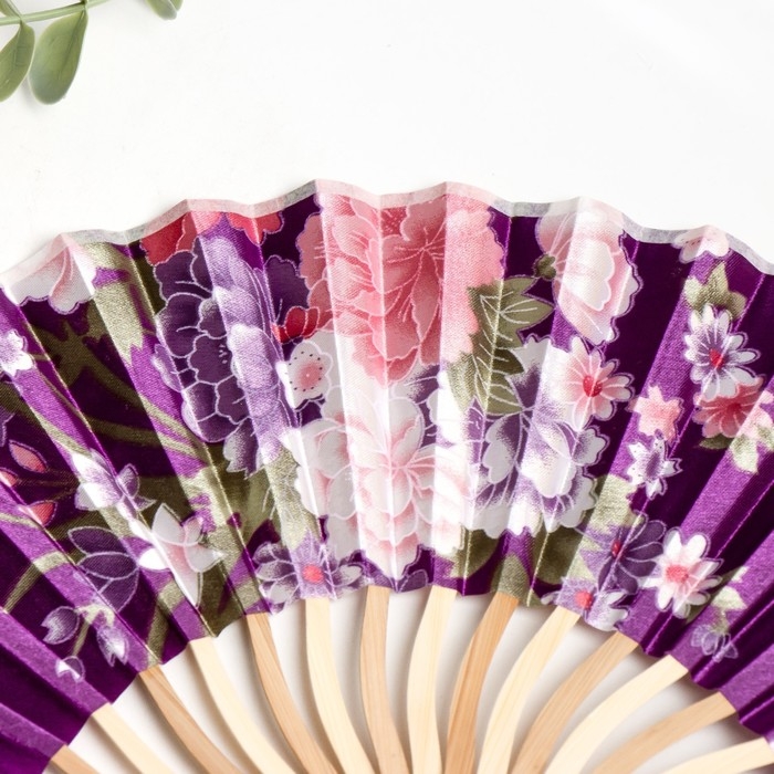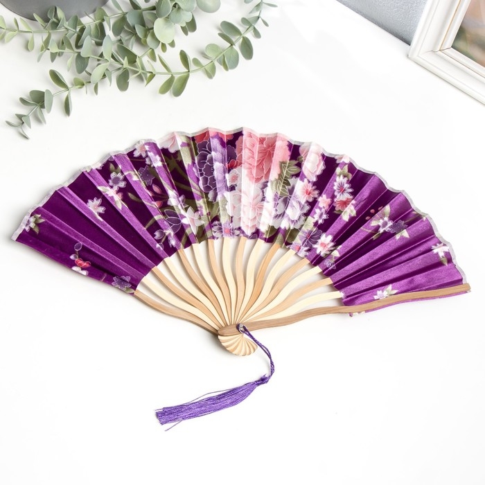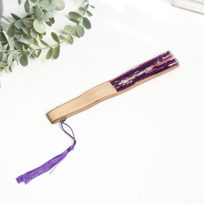 Веер бамбук, текстиль h=21 см изгиб, с кистью "Цветы" в коробке, фиолетовый