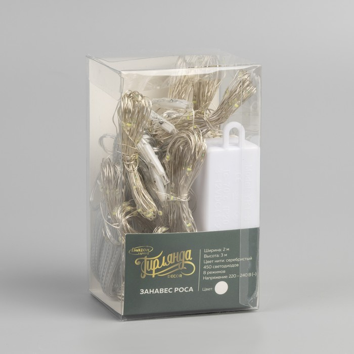 Гирлянда «Занавес» 2 × 3 м роса, IP20, серебристая нить, 450 LED, свечение белое, 8 режимов, 220 В