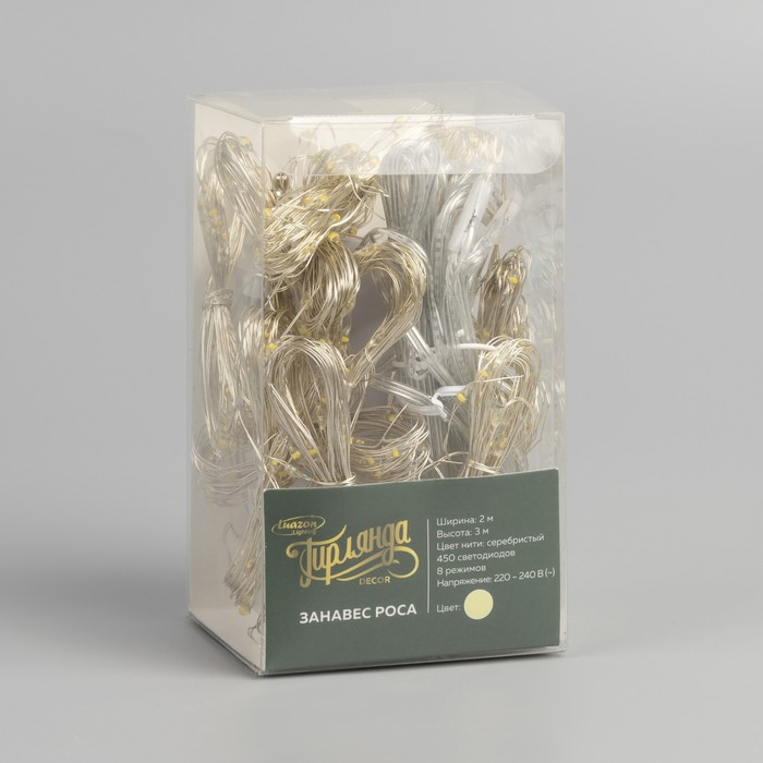 Гирлянда «Занавес» 2 × 3 м роса, IP20, серебристая нить, 450 LED, свечение тёплое белое, 8 режимов, 220 В