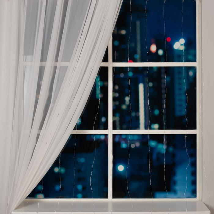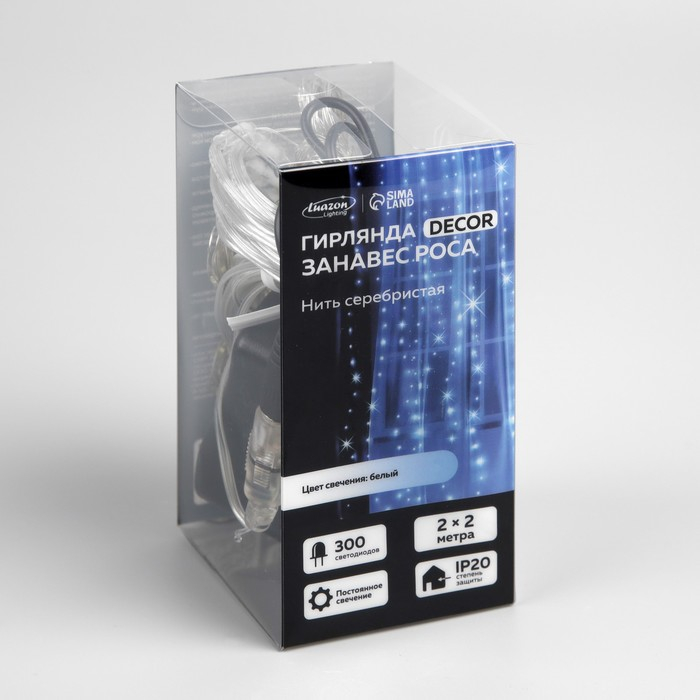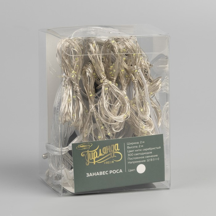 Гирлянда «Занавес» 2 × 2 м роса, IP20, серебристая нить, 300 LED, свечение белое, 12 В