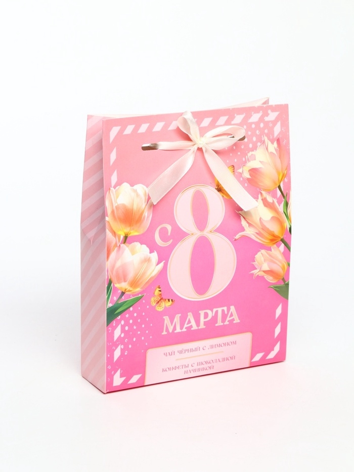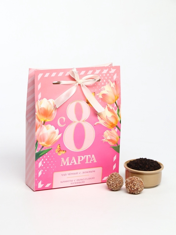 Набор "С 8 марта" чай черный с лимоном и конфеты в коробке-пакете