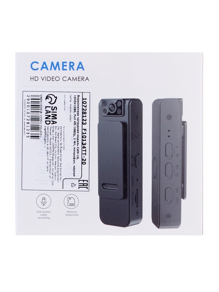 Видеокамера нагрудная CAM-16, 1920х1080, Full HD 1080p, 2 Мп, микрофон, чёрная
