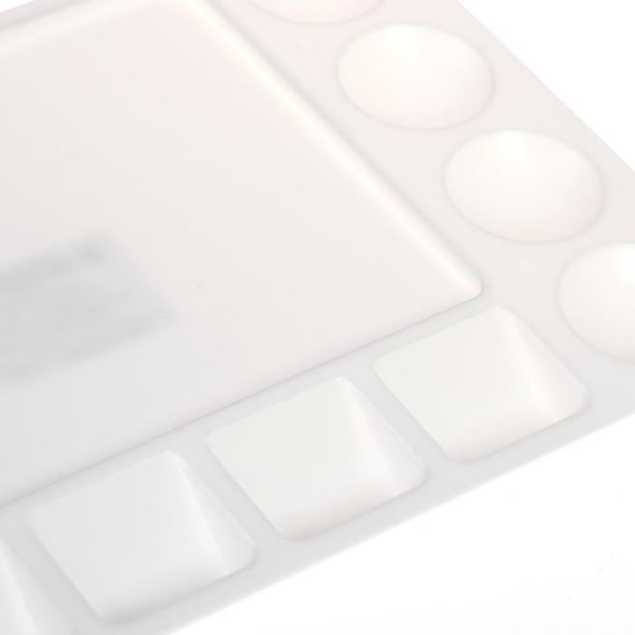 В палитре имеется отверстие для большого пальца руки, ячейки круглой и прямоугольной формы для красок и площадка для их смешивания. Закруглённые углы для безопасности использования.