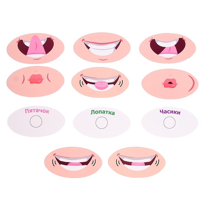 - Выбирайте задание, подбирайте к нему карточку с подходящим положением губ и языка и повторяйте упражнение за персонажем из набора.