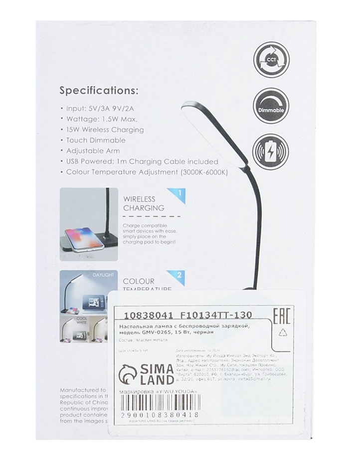 Настольная лампа с беспроводной зарядкой, GMV-0265, 15 Вт, черная