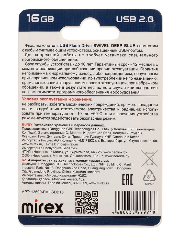 Флешка Mirex SWIVEL DEEP BLUE 16GB (ecopack)