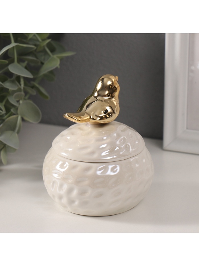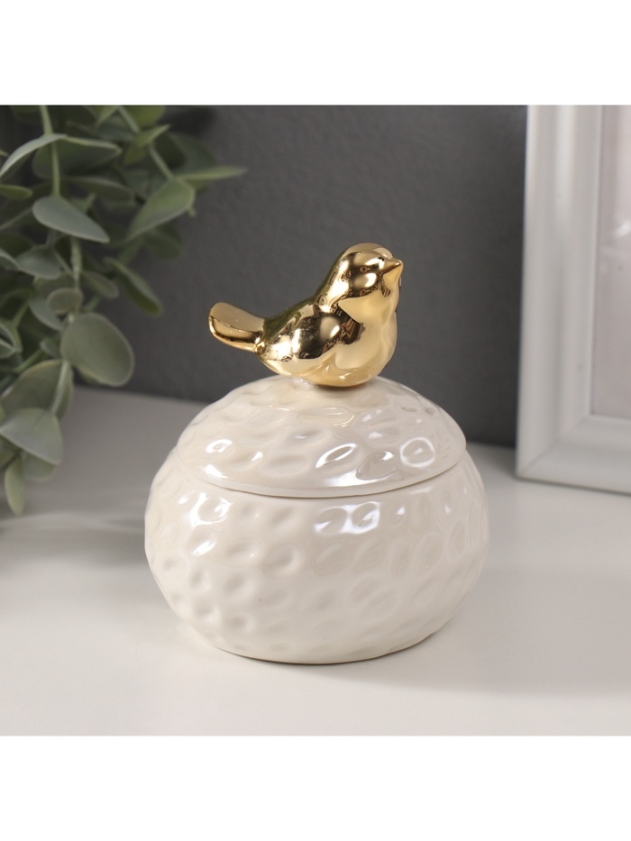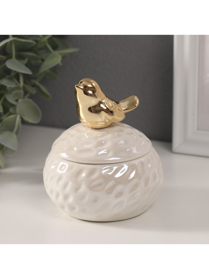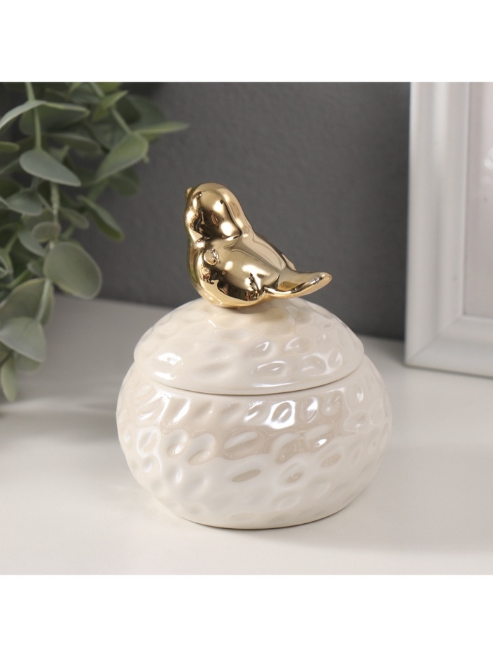 Шкатулка керамика "Золотая птичка на гнезде" белый перламутр 8,5х8,5х10 см