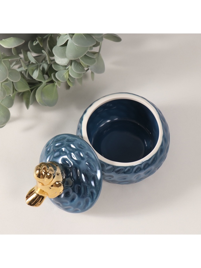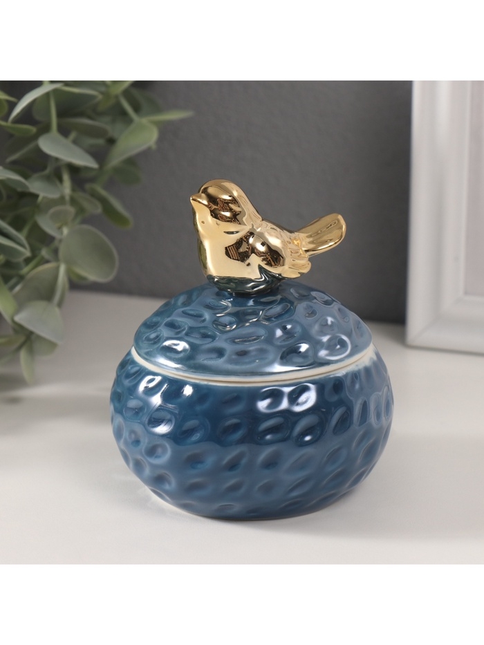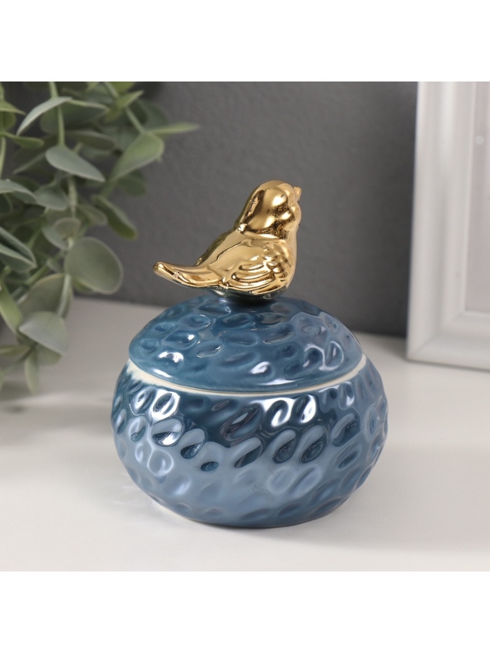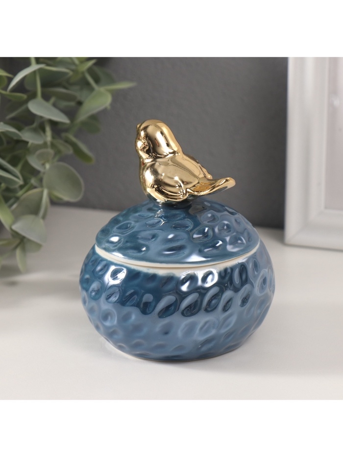 Шкатулка керамика "Золотая птичка на гнезде" синий перламутр 8,5х8,5х10 см