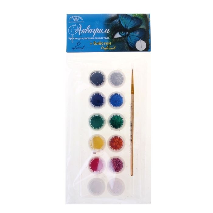 Краска для лица и тела «Аква-Колор», 3 мл, блёстки, кисть, набор 6 цветов