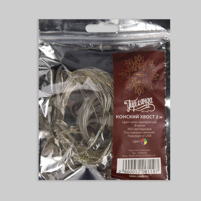 Гирлянда «Конский хвост» 8 нитей по 2 м, IP20, серебристая нить, 160 LED, свечение мульти, USB