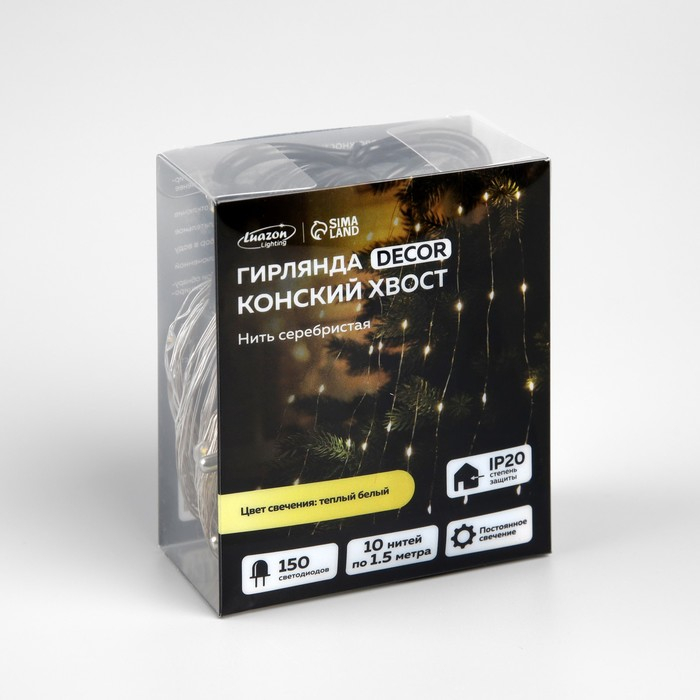 Гирлянда «Конский хвост» 10 нитей по 1.5 м, IP20, серебристая нить, 150 LED, свечение тёплое белое, 12 В