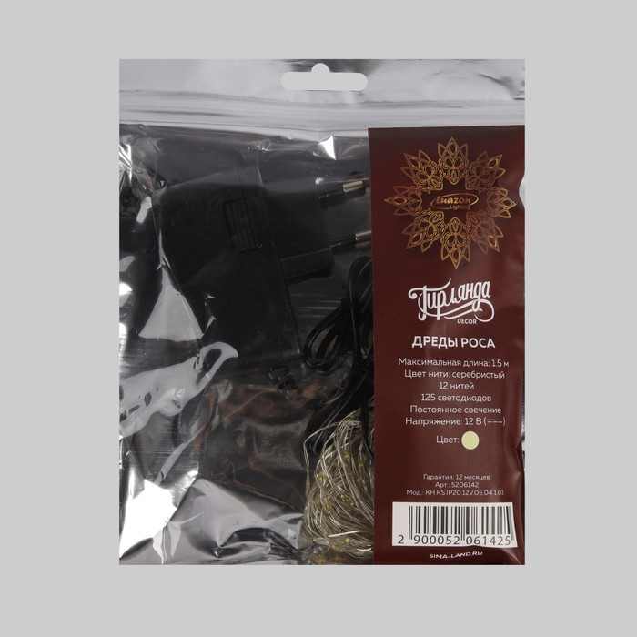 Гирлянда «Дреды» 1.5 м, IP20, серебристая нить, 125 LED, свечение тёплое белое, 12 В