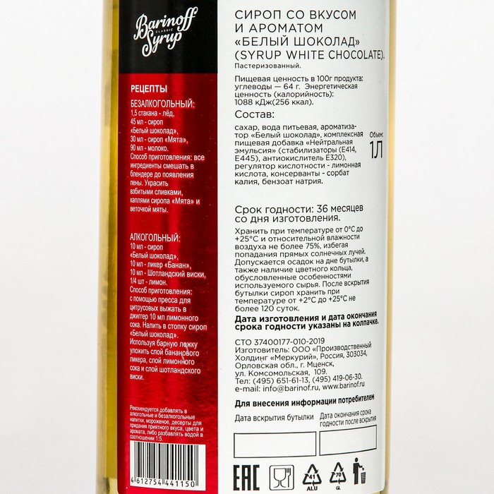 Состав: сахар, вода питьевая, сок виноградный концентрированный, ароматизатор «Белый шоколад», регулятор кислотности — лимонная кислота, консерванты — сорбат калия, бензоат натрия.