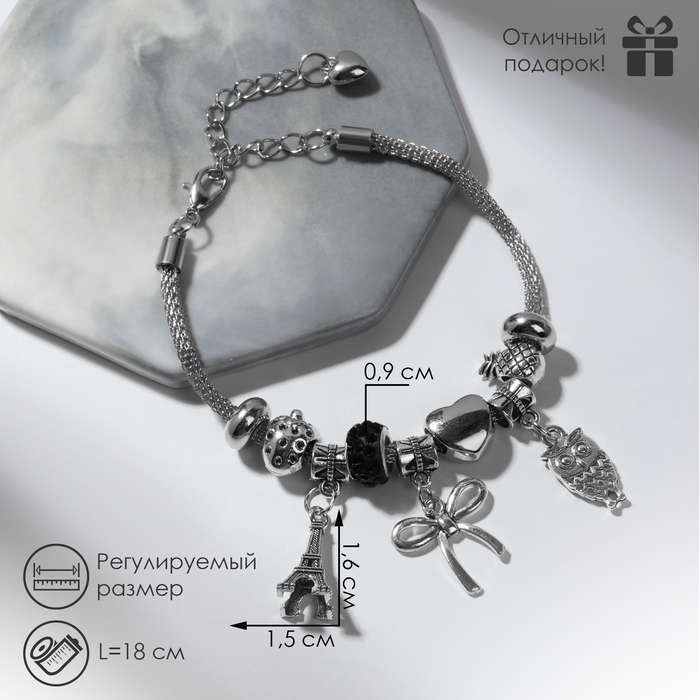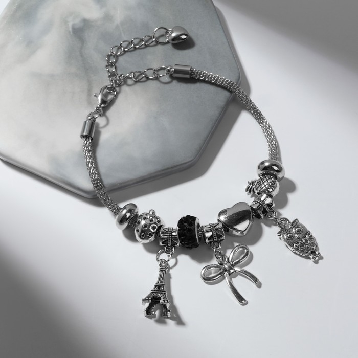Браслет ассорти «Марджери» романтик, сова, цвет чёрный в серебре, L=18 см
