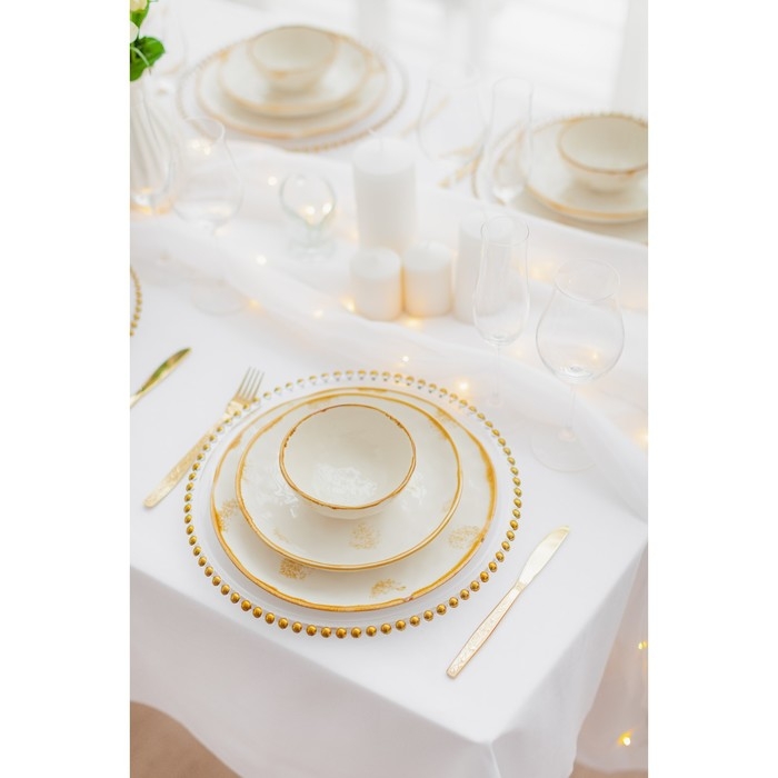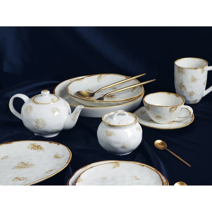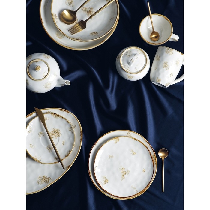 Оригинальная коллекция посуды Organic Gold от торговой марки Доляна не оставит никого равнодушным! Вся серия изготовлена из прочного фарфора и обладает неповторимым дизайном: рельефная «мятая» текстура и эффект золотой насыпи. Несмотря на свой изящный внешний вид, посуда рассчитана на ежедневное использование.