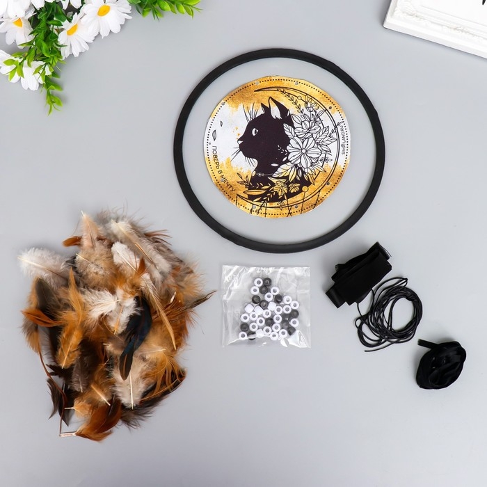 Набор для изготовления ловца снов "Чёрный кот с цветами - Поверь в мечту" d=20 см