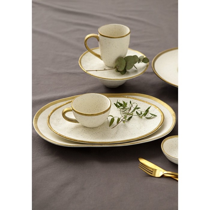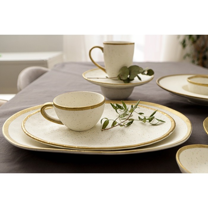 Посуда серии Magistro Poursephona — это современная фарфоровая посуда. В оформлении серии превалируют два цвета – бежевый оттенок фарфора и роскошное золото в виде широкой окантовки предметов. Идеально подходит как для формального обеда, так и для торжеств по особым случаям. Лаконичные формы, золотая окантовка, разноцветные вкрапления придают изделиям из фарфора одновременно необычный и современный вид.