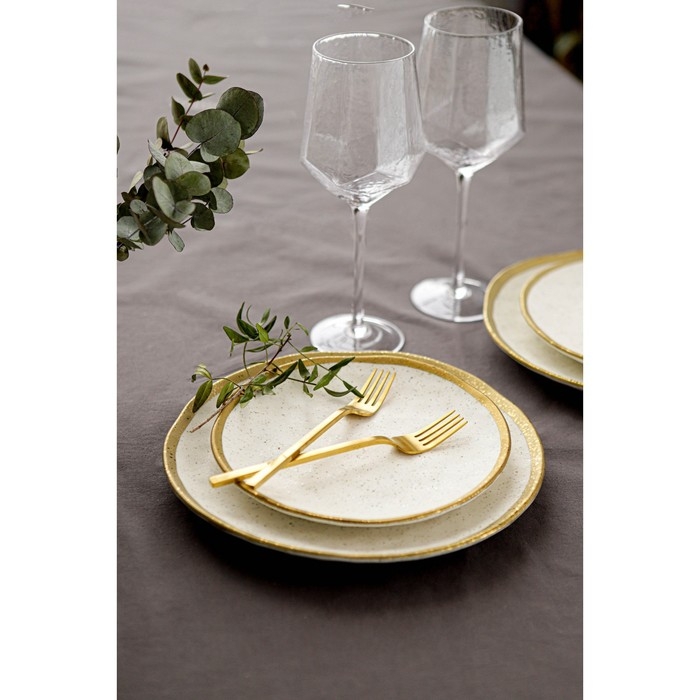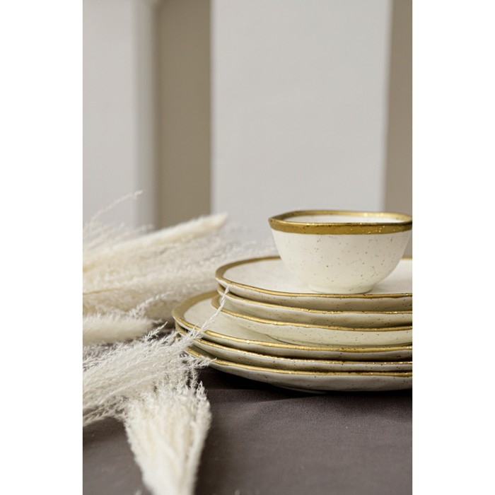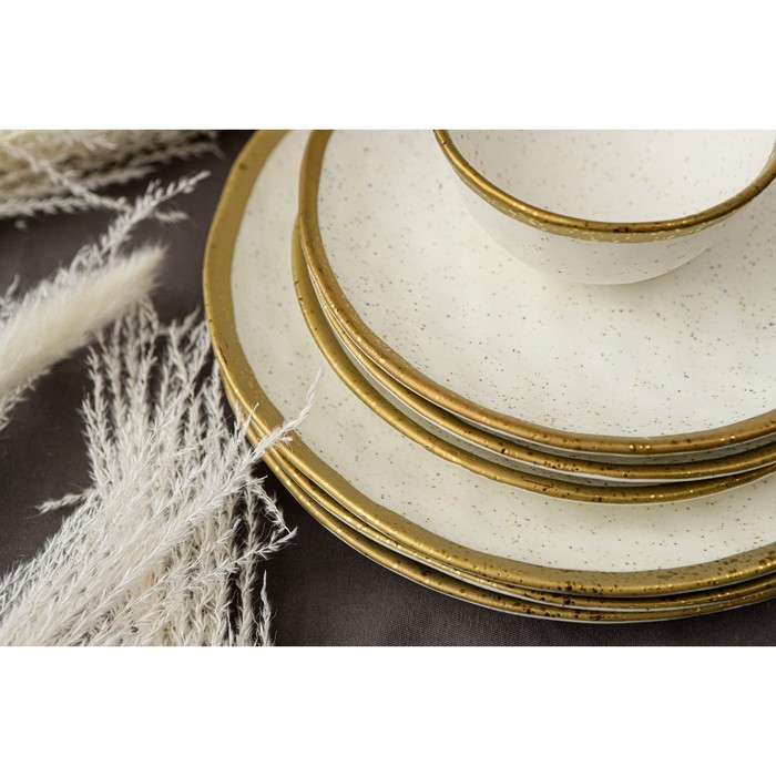 Посуда серии Magistro Poursephona — это современная фарфоровая посуда. В оформлении серии превалируют два цвета – бежевый оттенок фарфора и роскошное золото в виде широкой окантовки предметов. Идеально подходит как для формального обеда, так и для торжеств по особым случаям. Лаконичные формы, золотая окантовка, разноцветные вкрапления придают изделиям из фарфора одновременно необычный и современный вид.