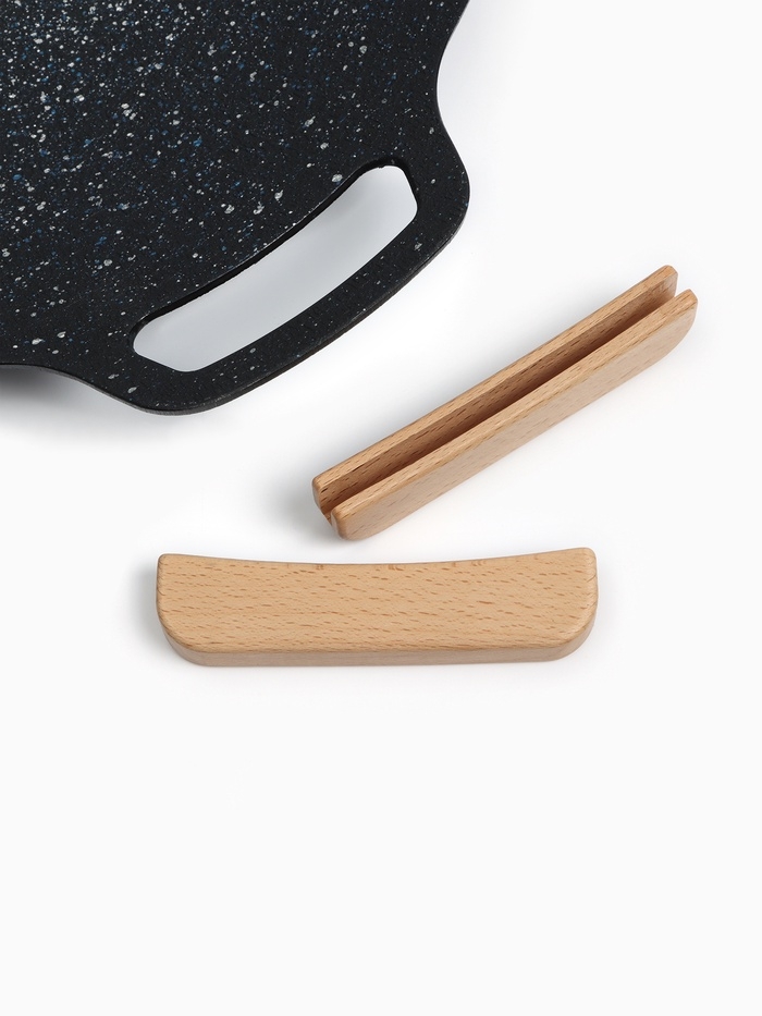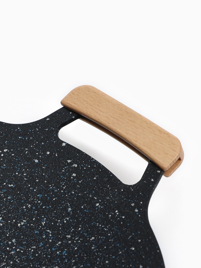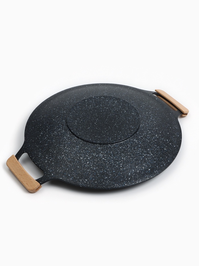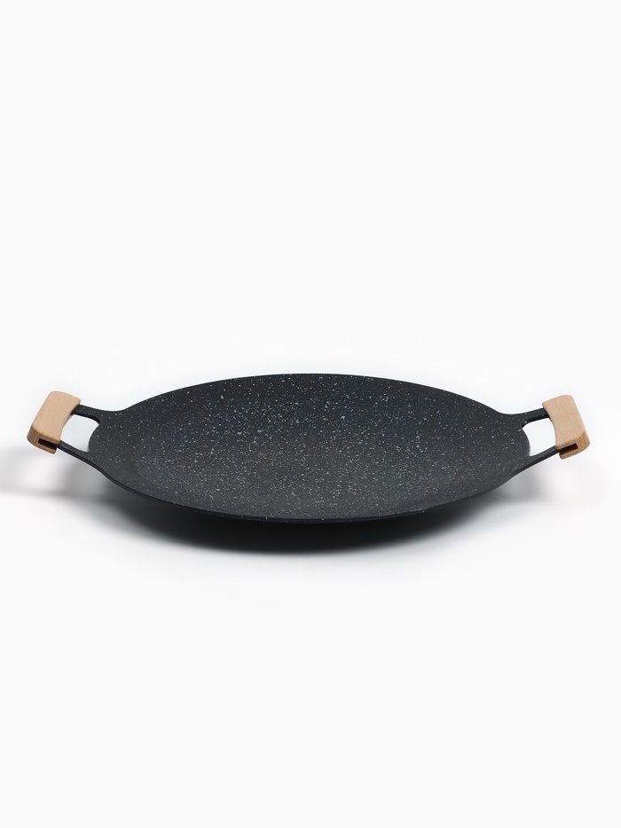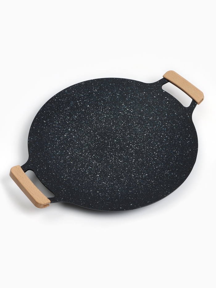 Изделие выполнено из долговечного алюминия, который устойчив к высоким температурам и деформациям. Специальное покрытие препятствует пригоранию пищи и позволяет готовить с минимальным использованием масла, сохраняя сочность и аромат блюд. Удобные ручки по бокам обеспечивают комфортное перемещение тарелки даже при нагреве.