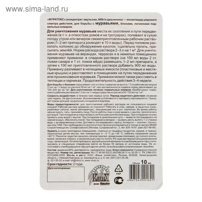 «МУРАТОКС» — инсектицид широкого спектра действия, для борьбы с муравьями, блохами, личинками подвальных комаров (концентрат эмульсии, 600 г/л диазинона). Эффективно уничтожает муравьев в местах их скопления и на пути передвижения, в том числе в отмостках домов и на тротуарах.
