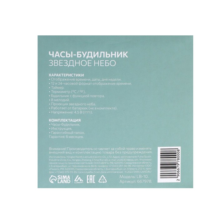 Будильник Luazon LB-10 "Звездное небо", часы, 8 мелодий, белый