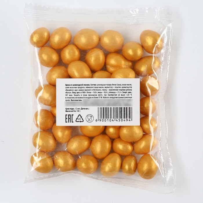 Состав: шоколадная глазурь белая (сахар, какао-масло, сухие молочные продукты, эквивалент какао-масла, эмульгатор - лецитин, ароматизатор "Ванилин"), ядро арахиса жареного отбелённого, глянец- комплексная пищевая добавка "Капол".