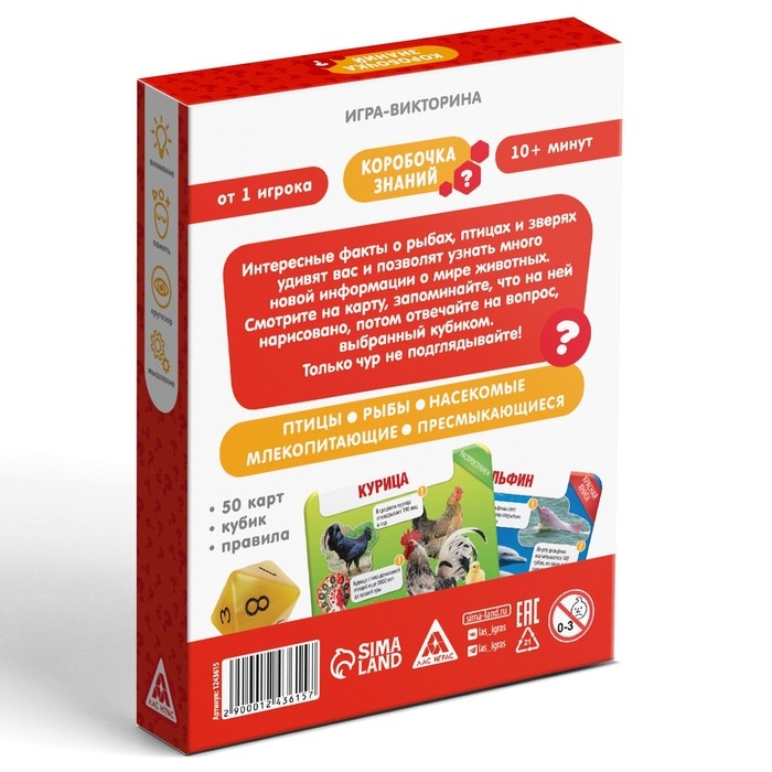 Настольная игра-викторина «Коробочка знаний. Животные всего мира», 50 карт, кубик, 7+