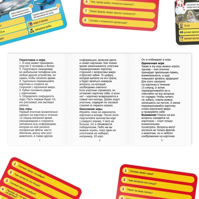 В наборе вы найдёте 50 карточек. На них находятся фотографичные изображения животных, а также информация о них: место обитания и интересные факты. Изучив карточку в течение 15 секунд, бросьте кубик. Цифра укажет номер вопроса. Все вопросы находятся на обороте и относятся не только к числам и фактам, но ещё и к самому изображению на карточках. Игрок, верно ответивший на вопрос, забирает карточку себе. Побеждает, разумеется, самый внимательный участник, набравший больше всего карт!