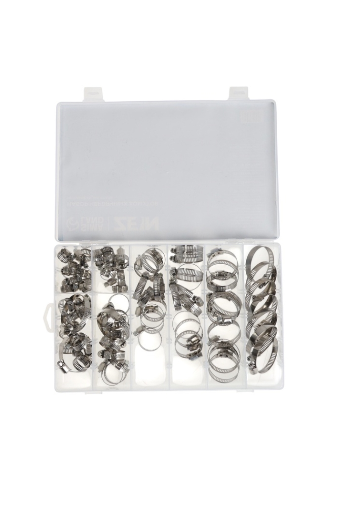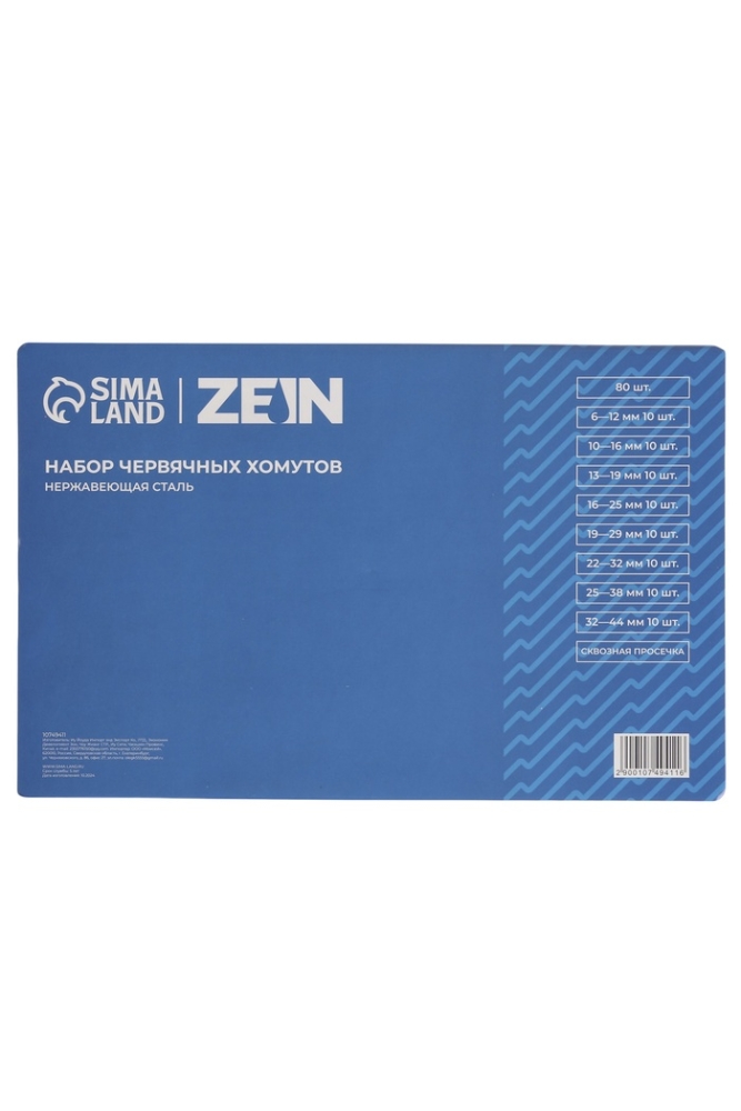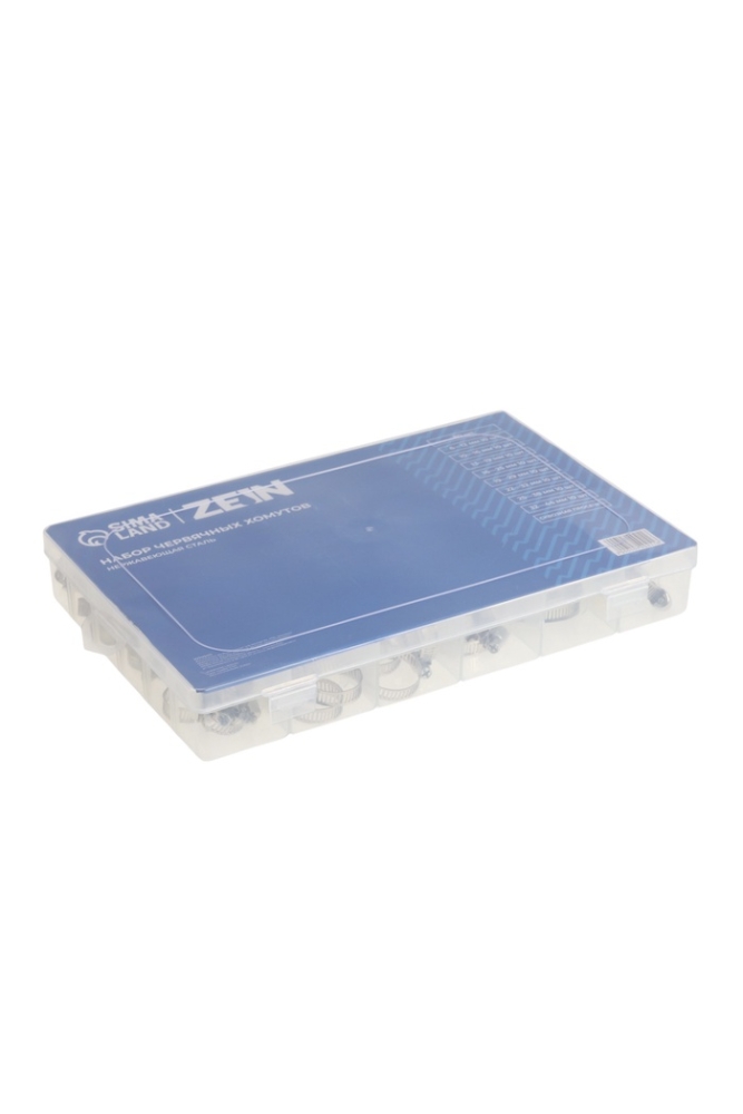 Набор червячных хомутов ZEIN engr, сквозная просечка, от 6 до 44 мм, нерж. сталь, 80 шт
