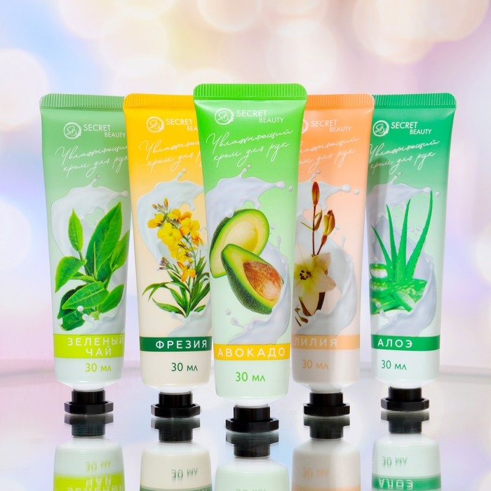 В набор входят увлажняющие крема: Крем для рук с экстрактом оливы 30 мл, Крем для рук с экстрактом ромашки 30 мл, Крем для рук с авокадо 30 мл, Крем для рук с алоэ вера 30 мл, Крем для рук с витамином Е 30 мл.