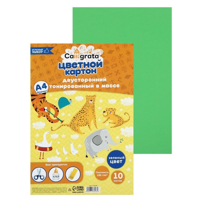 Картон цветной двусторонний А4, тонированный в массе, 10 листов, 180 г/м2, зелёный