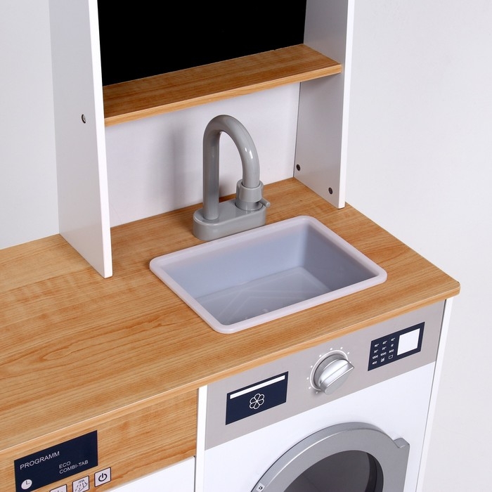 - Детская кухня оснащена реалистичными краном и мойкой из пластика. У крана крутится вентиль, вода не бежит.