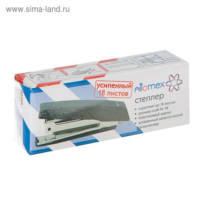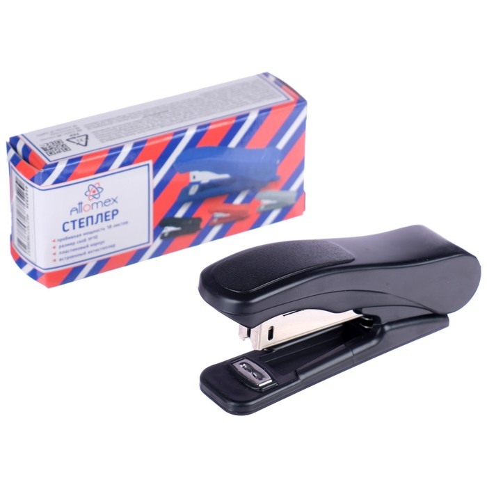 Степлер "Attomex" № 10 усиленный (мощность 18 листов, глубина скрепления 45 мм) пластиковый, в картонной коробке, со встроенным антистеплером, черный.