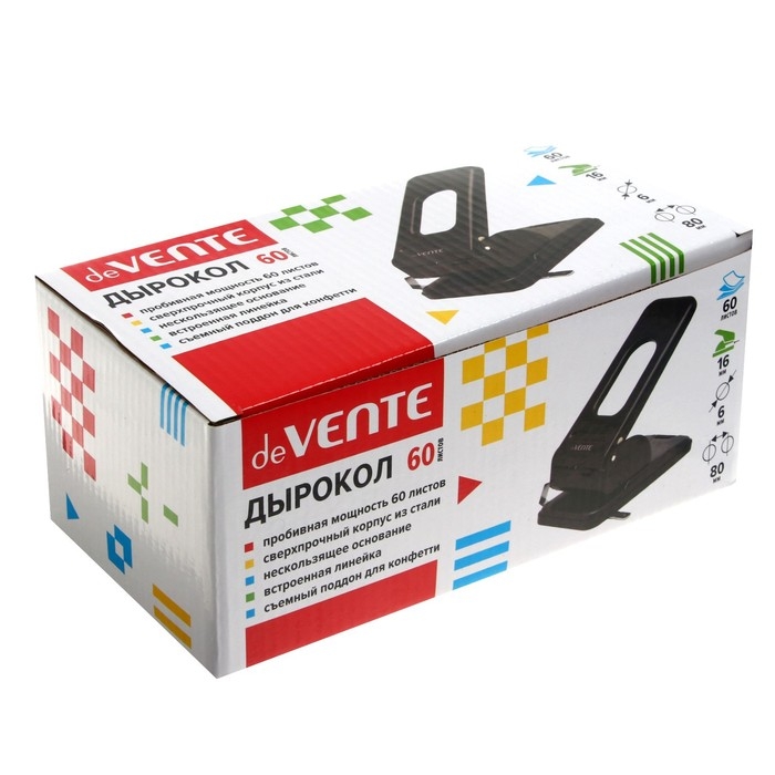 Дырокол большой мощности deVENTE (60 листов) металлический со встроенной металлической линейкой и съемным поддоном для конфетти, в картонной коробке, черный