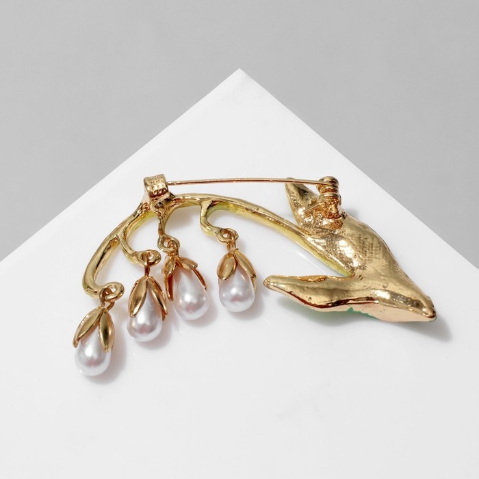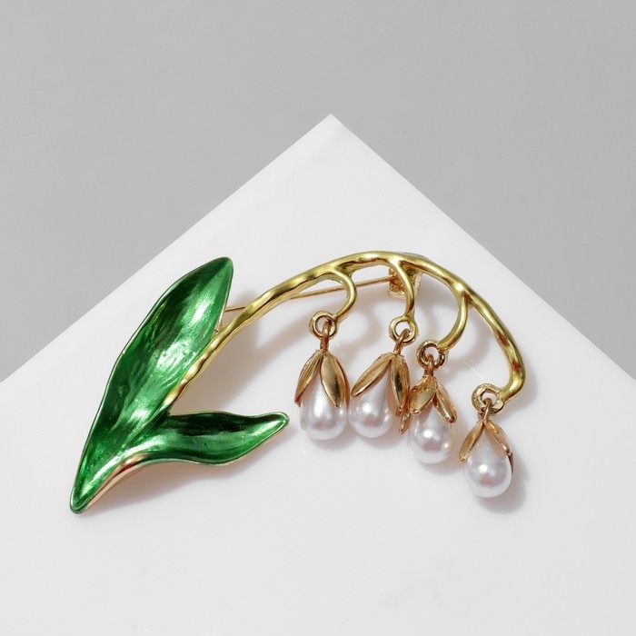 Брошь «Ландыши» веточка, цвет бело-зелёный в золоте