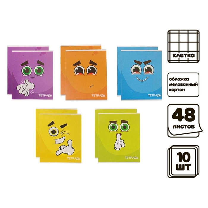 Комплект тетрадей из 10 штук (5 видов по 2 штуки), 48 листов в клетку Calligrata "Смайлики", обложка мелованный картон, блок офсет
