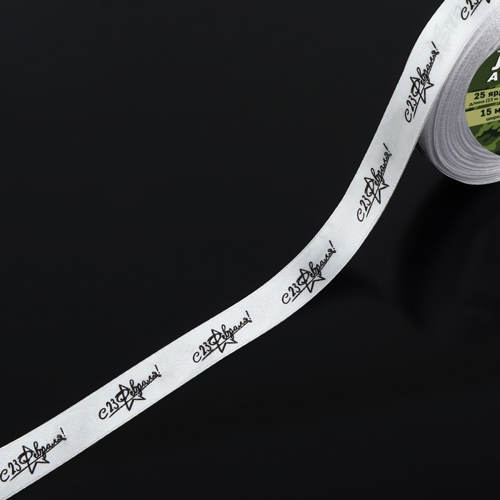 Лента атласная «С 23 Февраля!», 15 мм × 23 ± 1 м, цвет белый