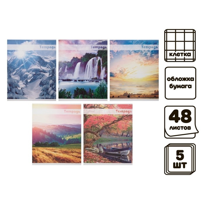 Комплект тетрадей из 5 штук (4 разные + 1 повторяющаяся), 48 листов в клетку Calligrata "Красоты природы", обложка мелованная бумага, блок №2, белизна 75% (серые листы)
