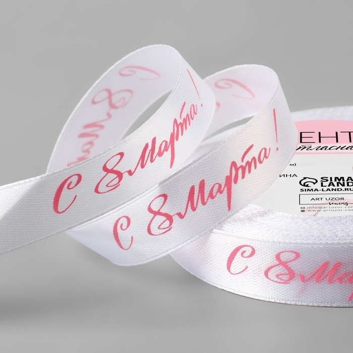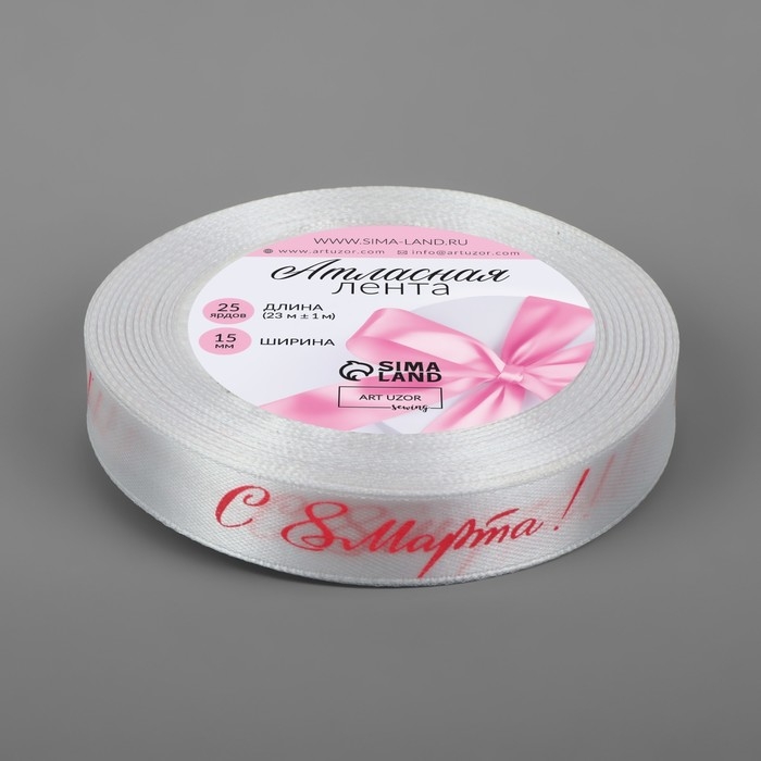Лента атласная «С 8 Марта», 15 мм × 23 ± 1 м, цвет белый/розовый №001