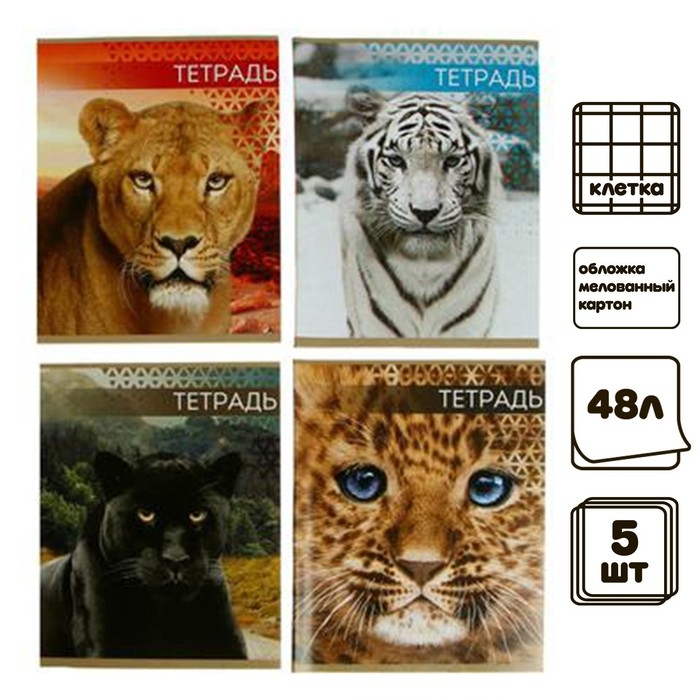 Комплект тетрадей из 4 штук, 48 листов в клетку Calligrata "Дикие кошки", обложка мелованный картон, блок №2, белизна 75% (серые листы)