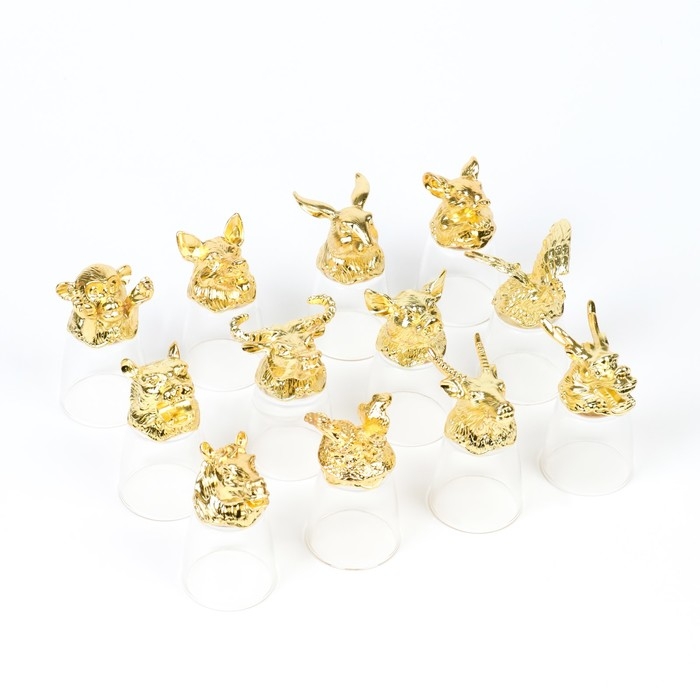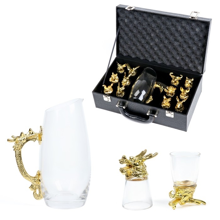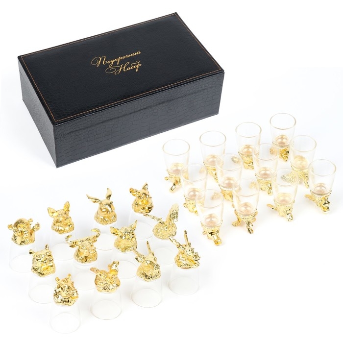 Подарочный набор стопок-перевертышей с головами животных (12 знаков зодиака) в стильном чёрном кожаном чемоданчике с ручкой. Каждая рюмка выполнена в форме фигурки животного из зодиакального цикла и имеет устойчивое основание. Такой набор будет незаменим на большом дружеском застолье или на охотничьем привале, а также станет прекрасным презентом для тех, кто любит оригинальные подарки!
