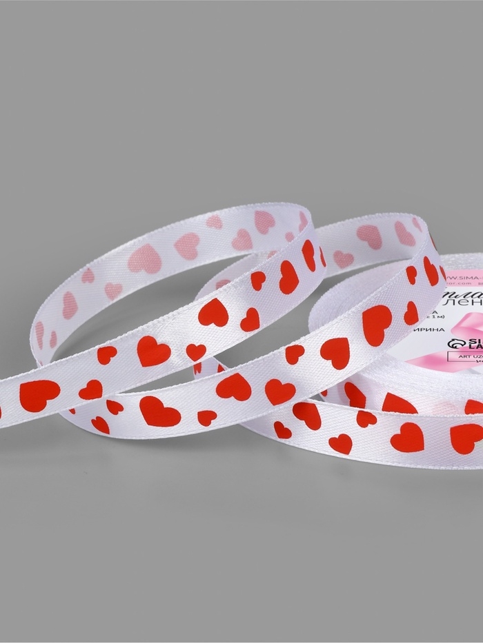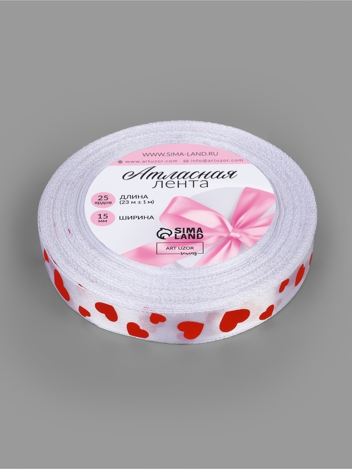 Лента атласная 15мм*25±1ярд(23м±1м) красные сердечки белый №1 АУ