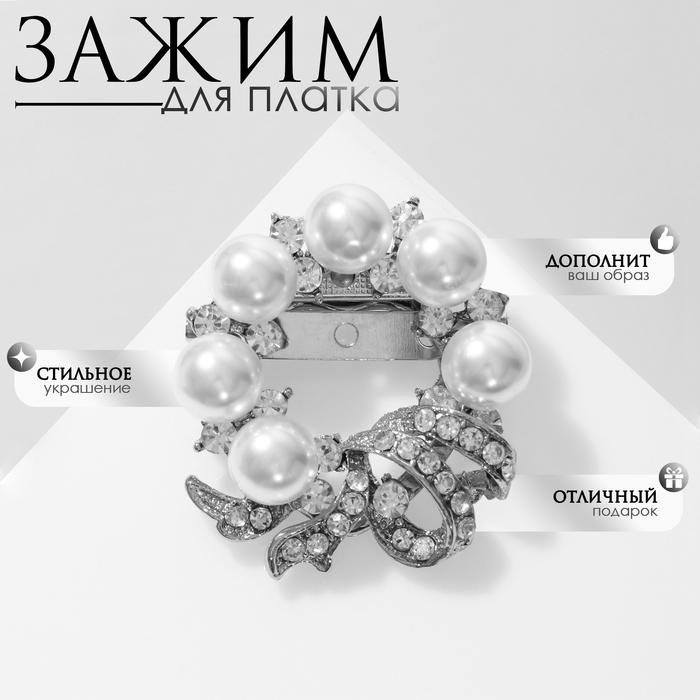 Зажим для платка «Жемчужный бант», цвет белый в серебре