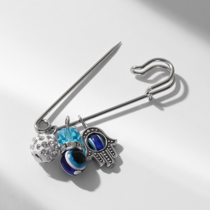 Булавка-оберег 3 подвески «Рука Хамса с бусиной», 5 см, цвет синий в серебре
