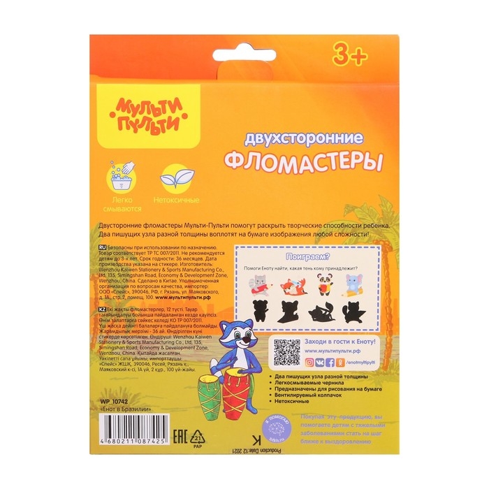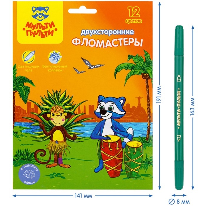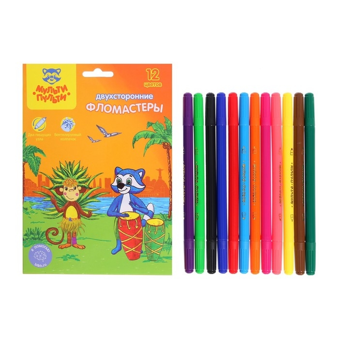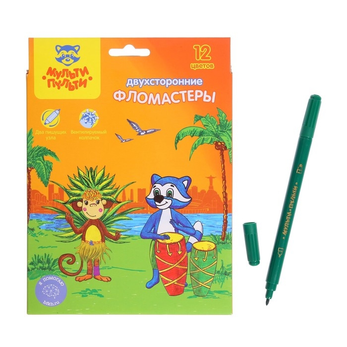 Фломастеры 12 цветов двусторонние Мульти-Пульти «Енот в Бразилии», смываемые