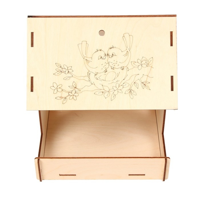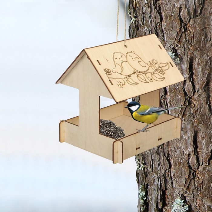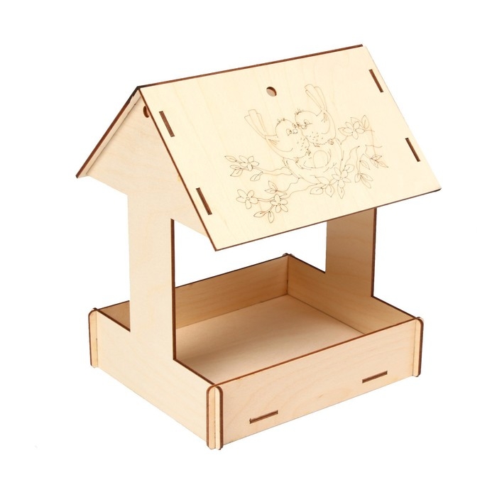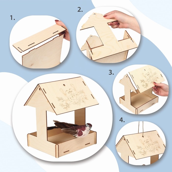 Чтобы собрать кормушку, аккуратно соедините фанерные детали, вставляя их в пазы. Используйте клей для лучшей фиксации. При желании модель можно раскрасить или задекорировать.