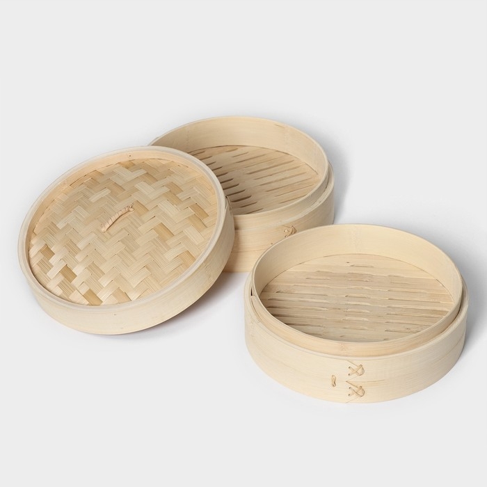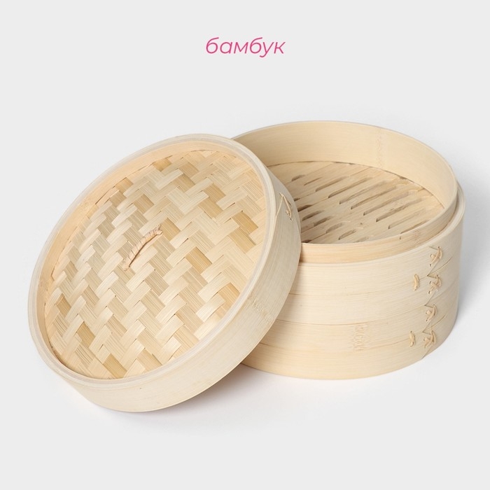 Конструкция из бамбуковых ёмкостей предназначена для приготовления пищи на пару. Резервуаром для воды в данном случае выступает кастрюля или сковорода WOK (в комплект не входит). Обработка паром сохраняет полезные свойства продуктов, делает блюда сочными и нежными. Изделие подходит для приготовления овощей, риса, рыбы и мяса, пельменей, мантов и хинкалей.