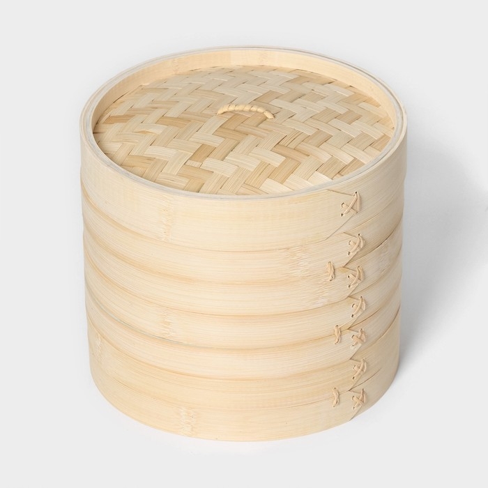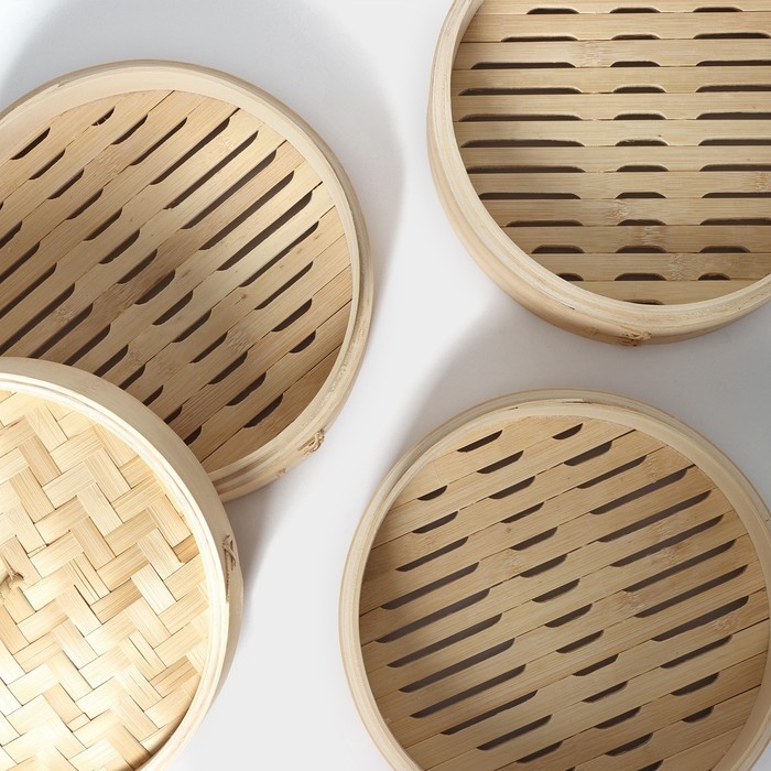 Конструкция из бамбуковых ёмкостей предназначена для приготовления пищи на пару. Резервуаром для воды в данном случае выступает кастрюля или сковорода WOK (в комплект не входит). Обработка паром сохраняет полезные свойства продуктов, делает блюда сочными и нежными. Изделие подходит для приготовления овощей, риса, рыбы и мяса, пельменей, мантов и хинкалей.