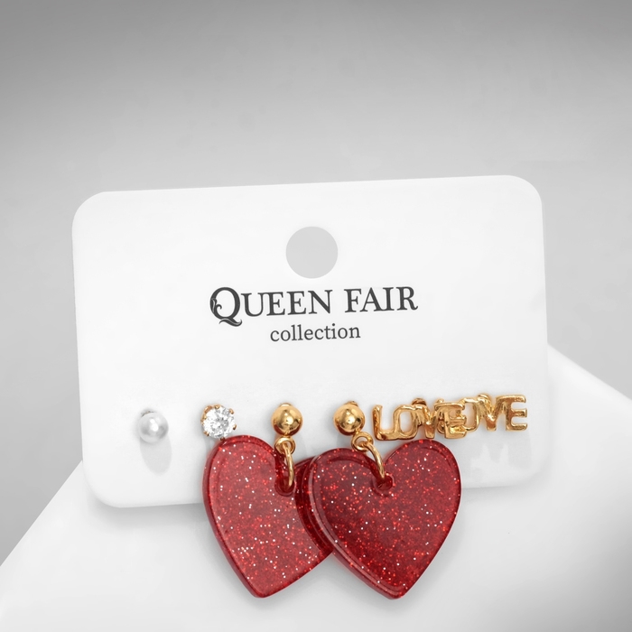 Серьги набор 3 пары LOVE сердечки, цвет бело-красный в золоте